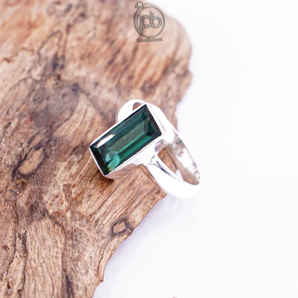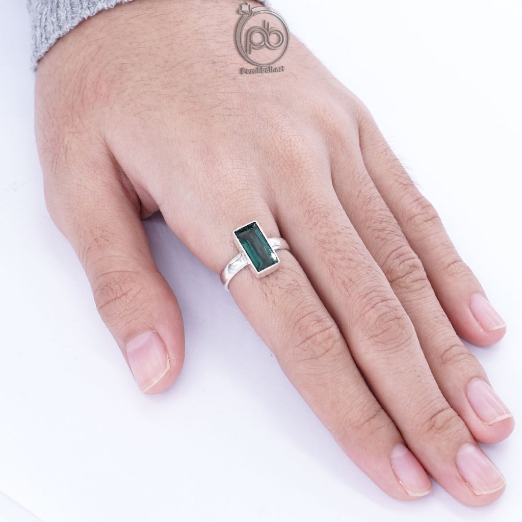 Cincin elegan dengan batu Natural Green Quartz berbentuk persegi berukuran 12 x 6 mm yang memancarkan kilau hijau segar.