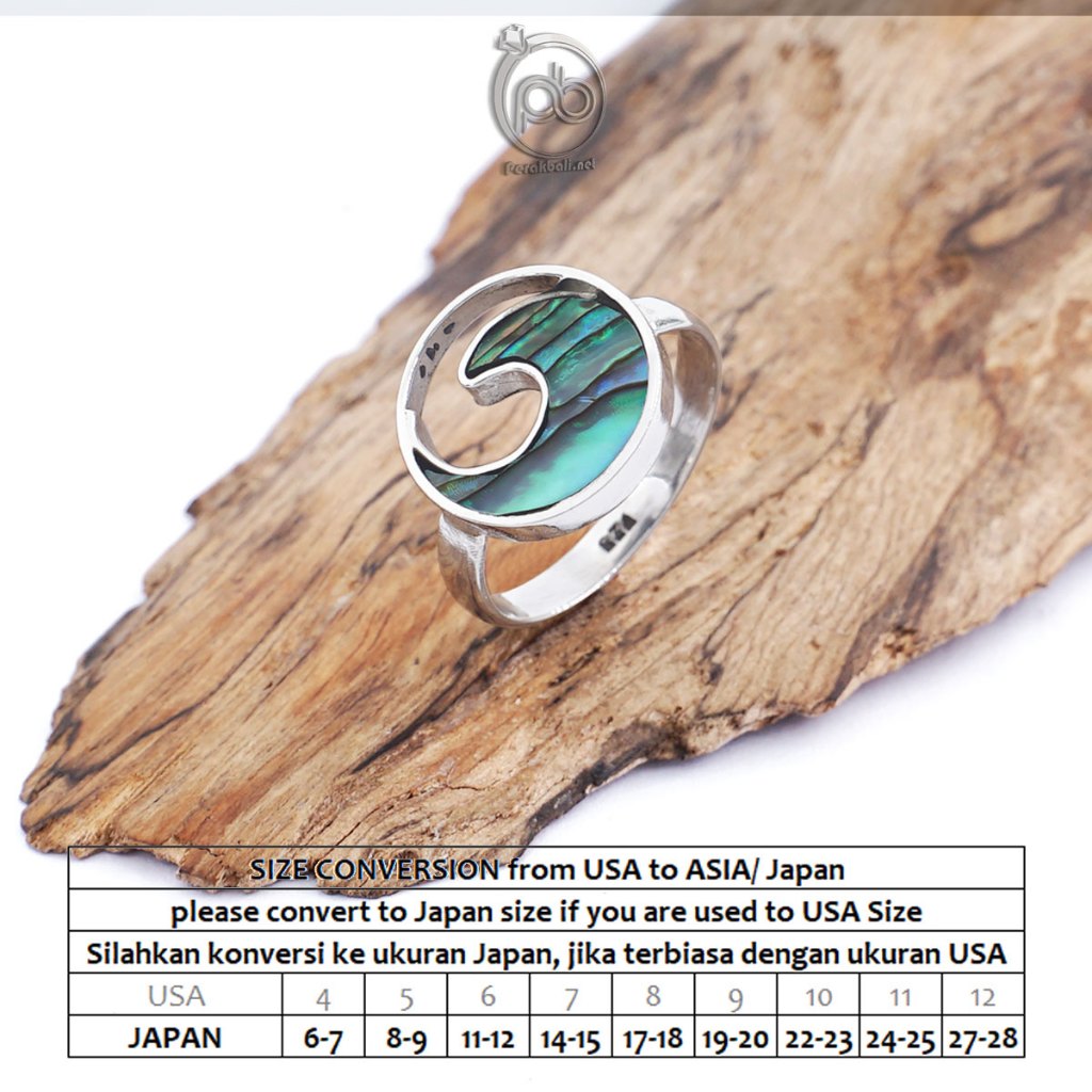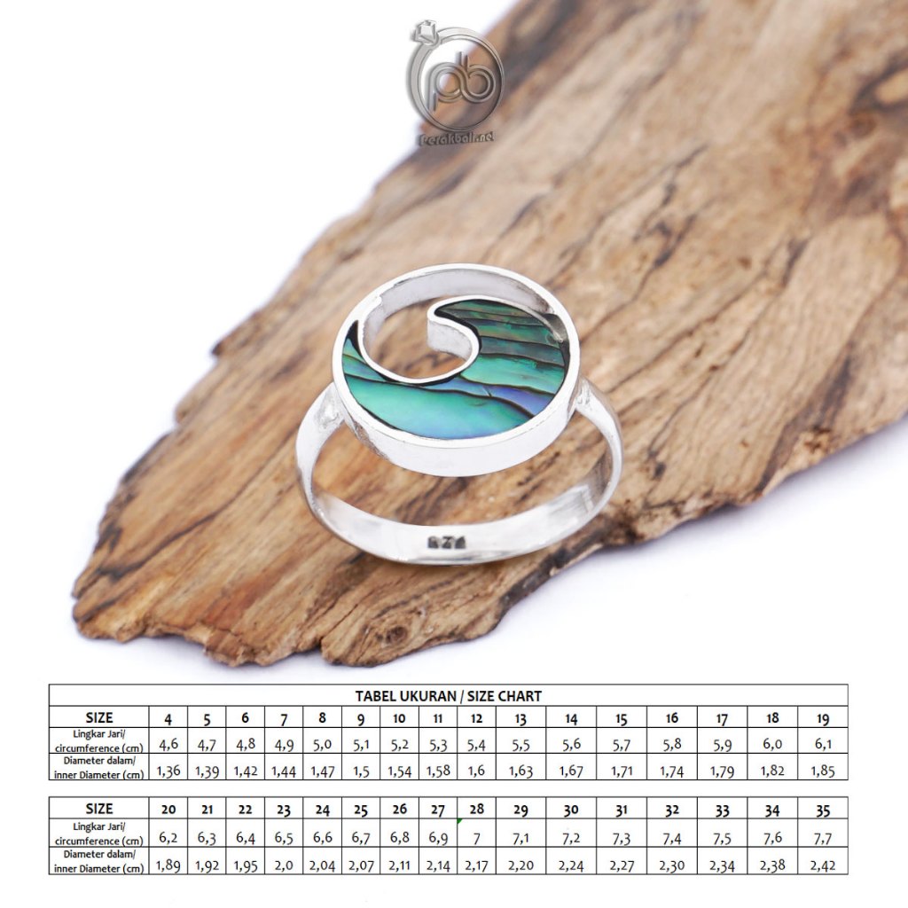 Cincin menawan ini menampilkan kerang batik Paua Abalone dengan motif ombak berbentuk bulat berukuran 14 x 14 mm.