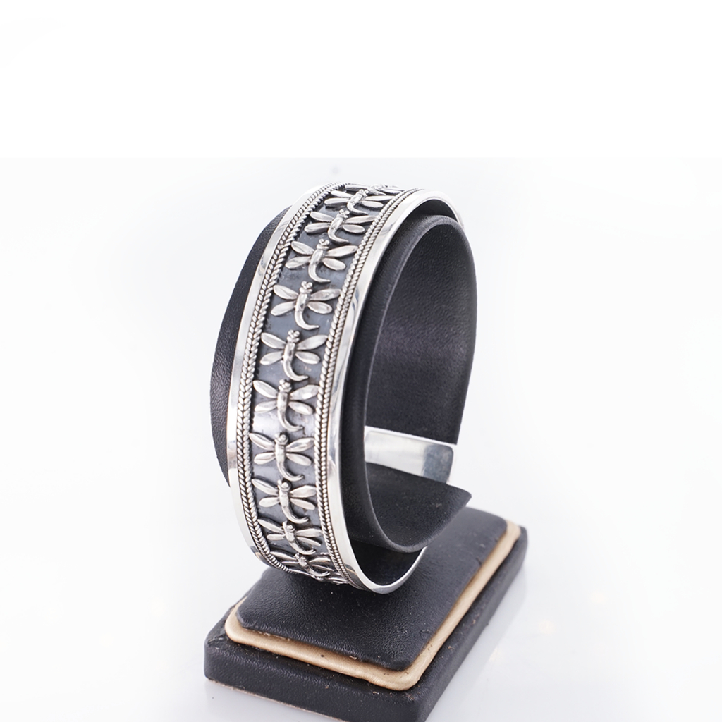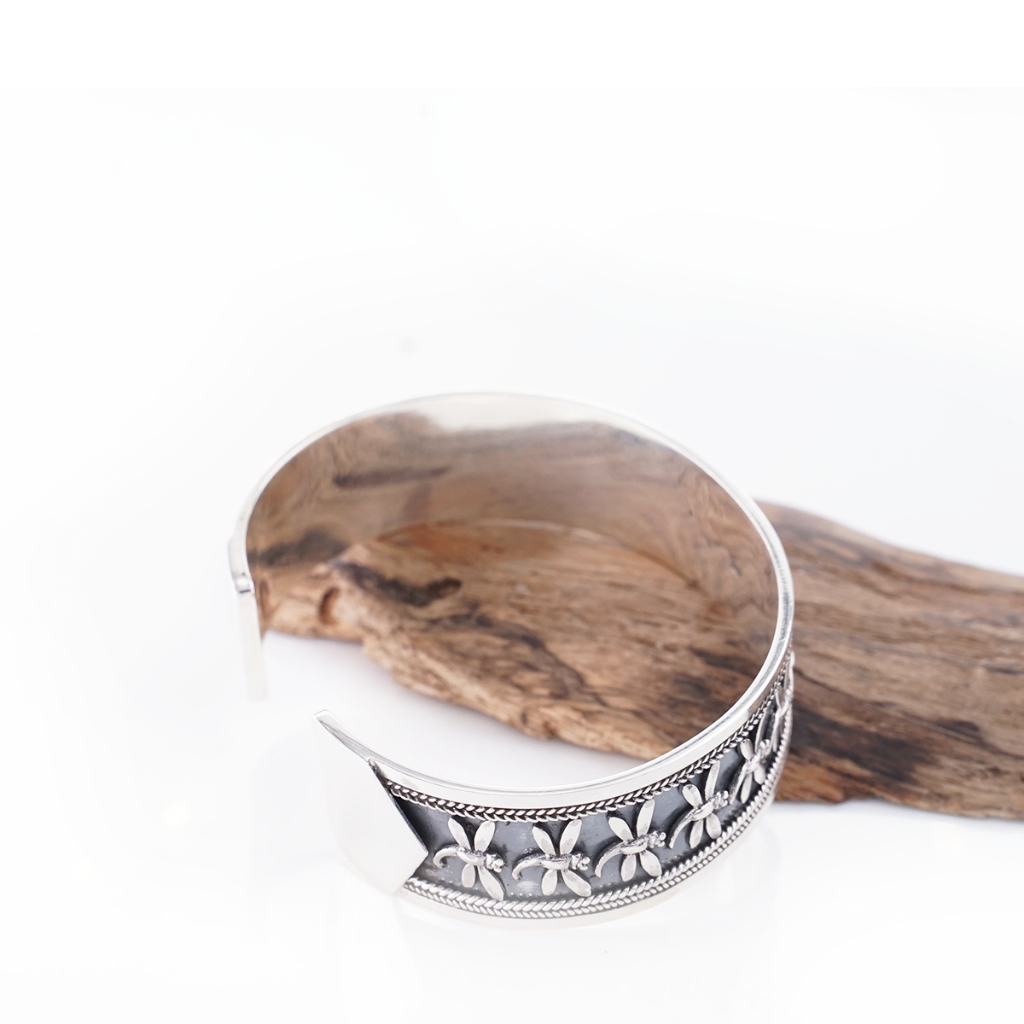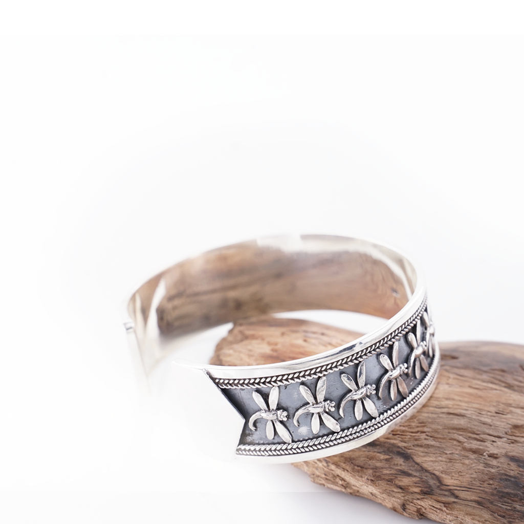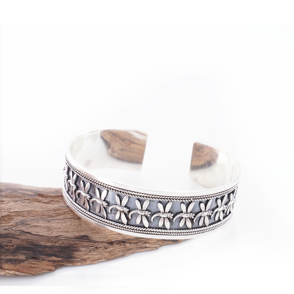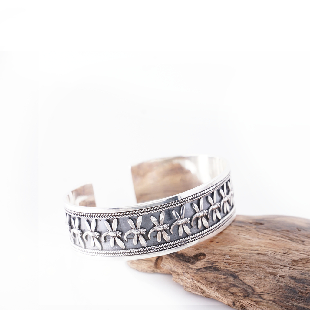 Gelang perak ini memadukan desain minimalis dengan keindahan alam. Dibuat dari perak 925 berkualitas tinggi, gelang ini memiliki motif capung yang diukir dengan detail halus, memberikan nuansa elegan dan bermakna. Desain cuff open bangle membuatnya fleksibel, nyaman digunakan, dan mudah disesuaikan dengan ukuran pergelangan tangan.
