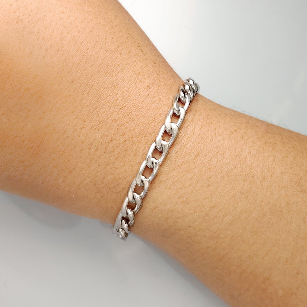 Dengan desain rantai Cuban yang lebar 5,5 mm dan tebal 2 mm, gelang ini memberikan kesan minimalis namun tetap elegan.