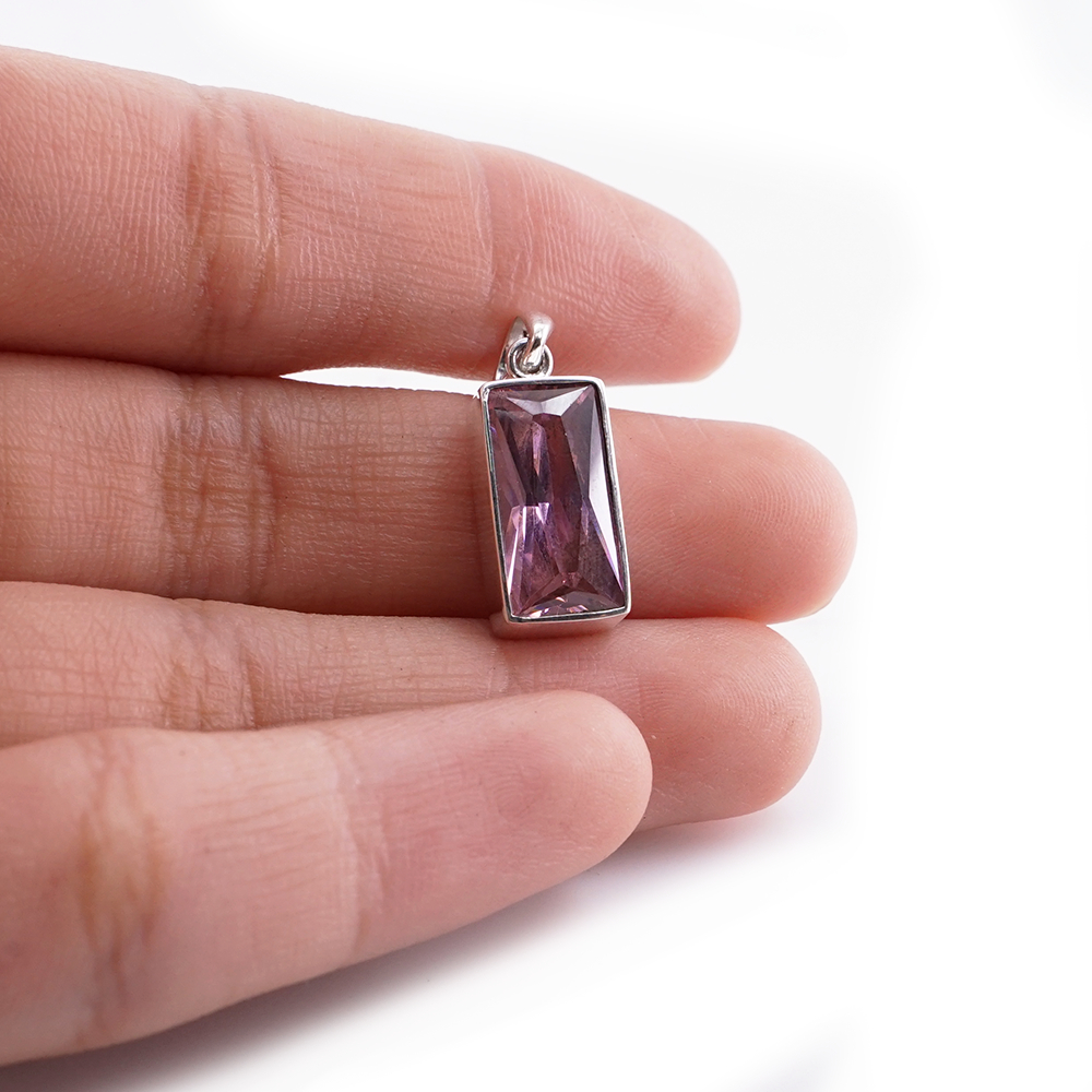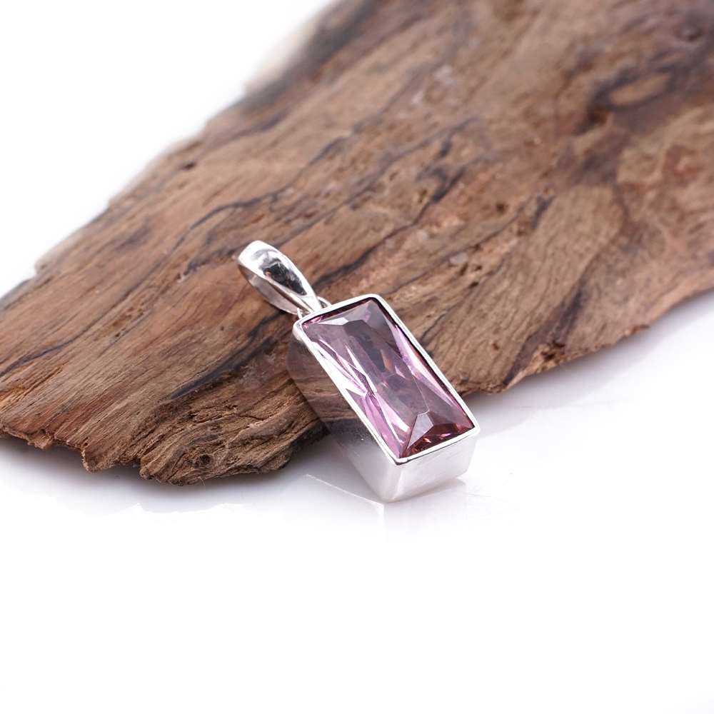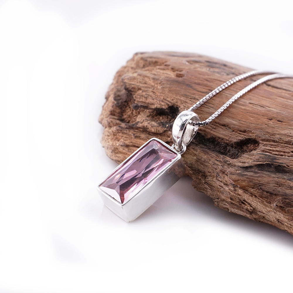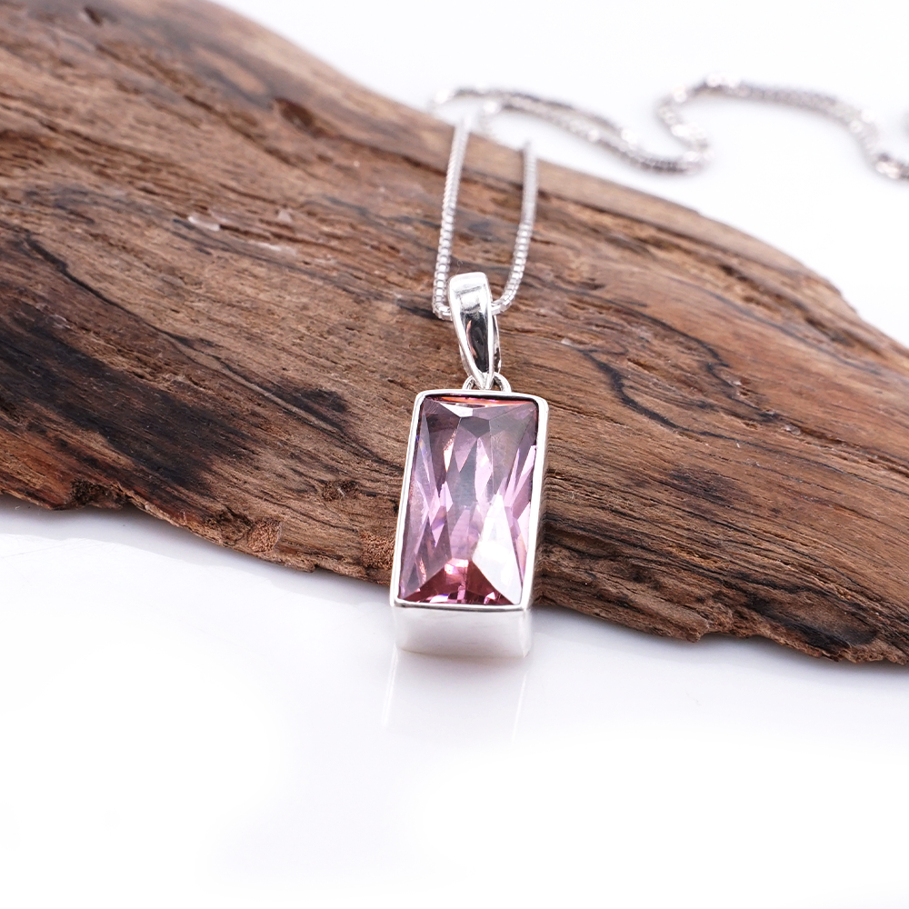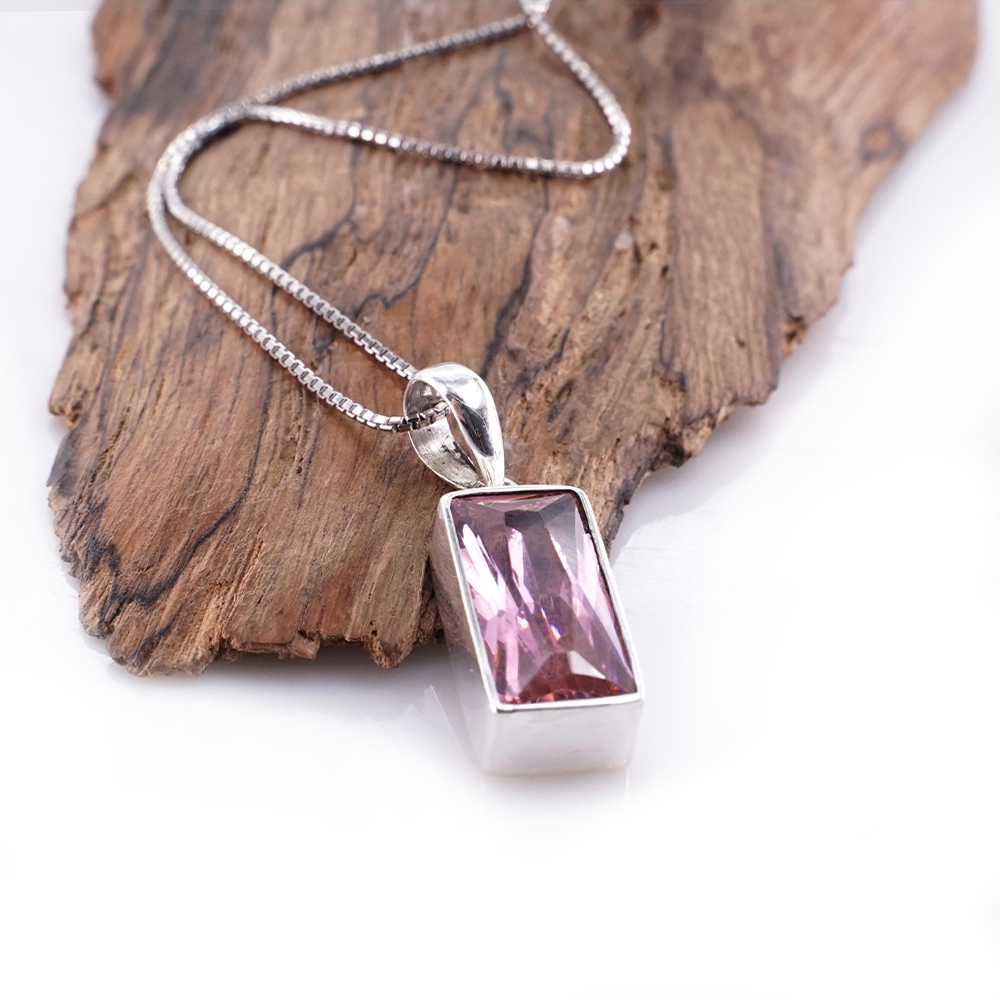 Liontin wanita ini menghadirkan batu Pink Zircon berbentuk persegi panjang yang tampil jernih dan lembut dalam balutan perak asli 925.